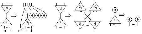 For decoding purpose, the interaction system is completed with an infinite set of indexed symbols, called decoders. A decoder (symbol "x") may have any arity and any index. The index represents a variable in the lambda-term. A decoder interacts only with the applicator, the duplicator or the eraser, as shown here: